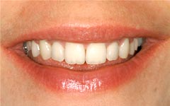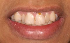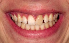 Bild 5: Alter: 21 Jahre – Die Zahnverfärbung am Schneidezahn (gelb schraffiert) sowie die beiden falsch laufenden Zahnachsen (rote Linien) sind die wesentlichen Störfaktoren in diesem sonst harmonischen Lachbild.
