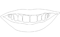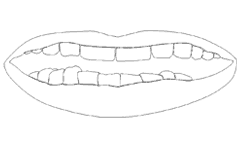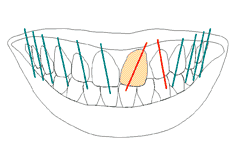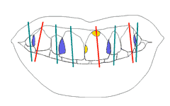 Bild 6: Alter: 18 Jahre – Karies (gelb) sowie Platzmangel mit Verschachtelungen der Zähne (blau schraffiert) und deshalb auch teils falschen laufenden Zahnachsen (rote Linien) führen zu einem stark gehemmten Lachen.