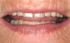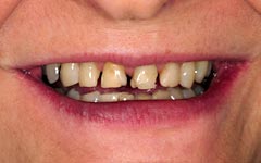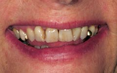 Bild 4: Alter: 58 Jahre – Verfärbungen an alten Füllungen (orange) sowie der Verlust der korrekten Zahnkontur/Zahngröße (blau) führen zu einem sehr „ungepflegten“ Bild.