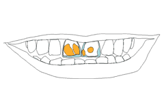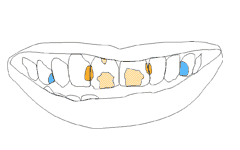 Bild 3: Alter: 55 Jahre – Verfärbungen an alten Füllungen (orange) und an den Zahnflächen (orange schraffiert) sowie Goldfüllungen (blau) sind deutliche Blickfänger.